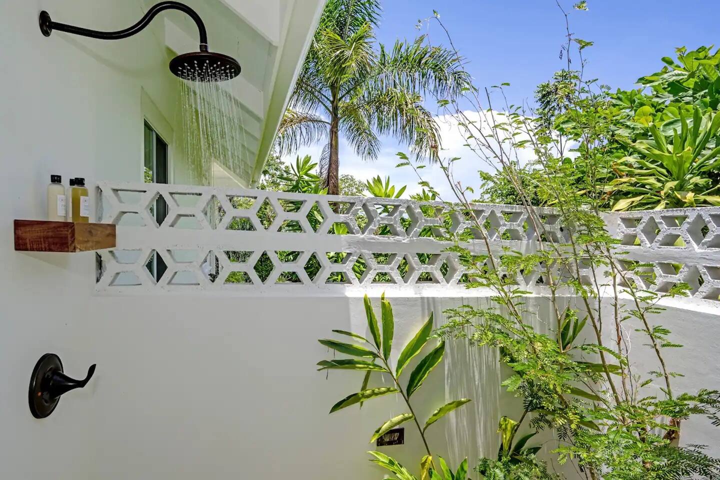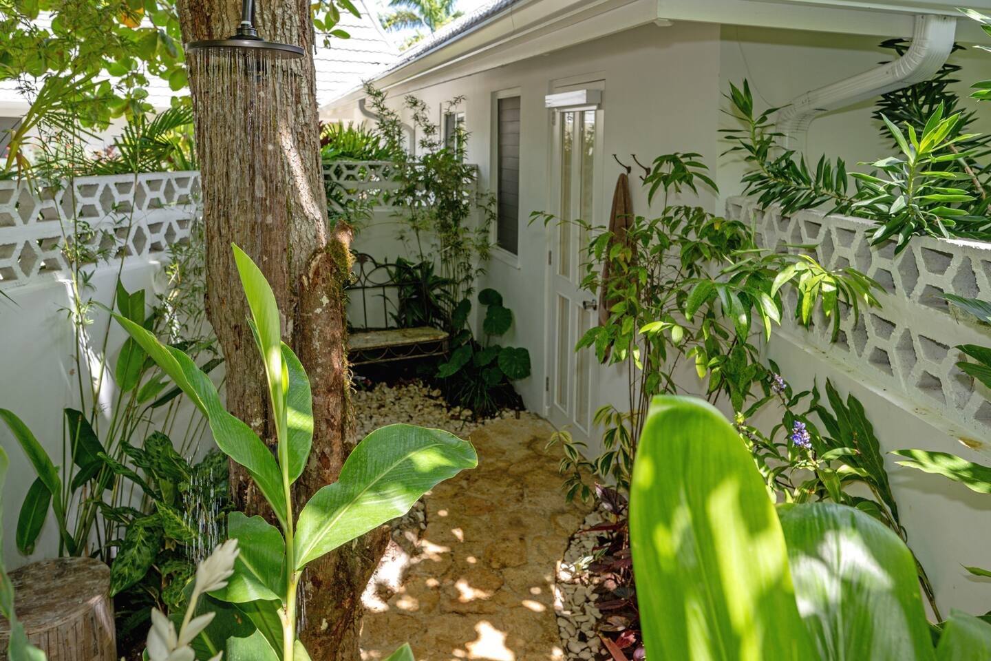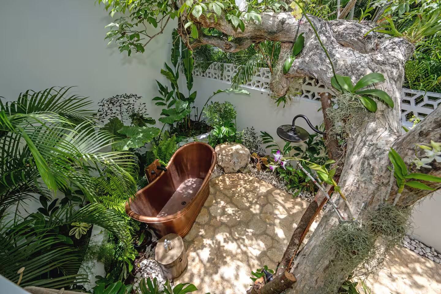 Outdoor garden shower with a copper tub beneath a flowering poui tree
